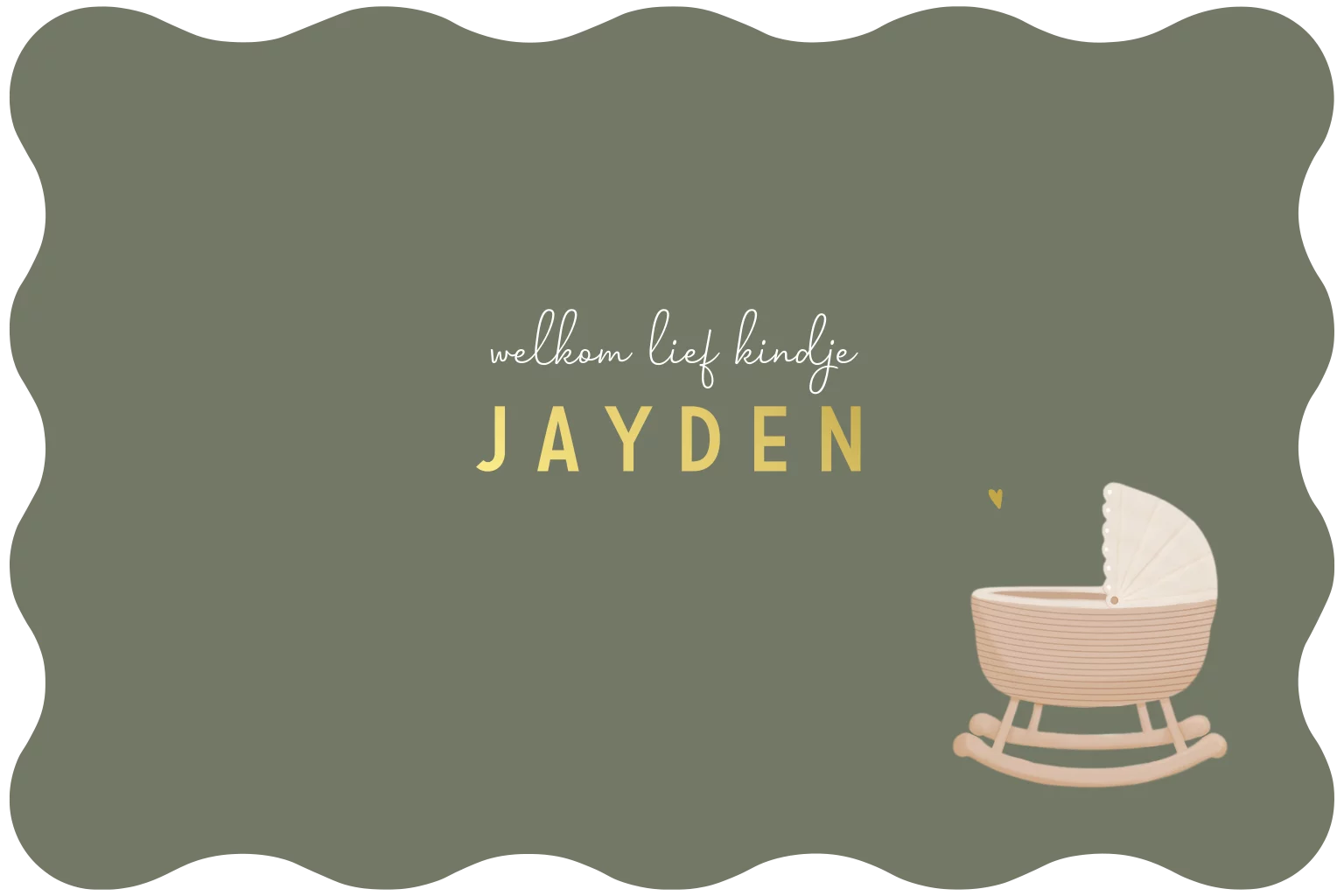 Dit geboortekaartje in stijlvol olijfgroen met golfrand en schattig wiegje is een uniek en tijdloos ontwerp voor de geboorte van jullie kleintje. Personaliseer naar wens in onze online editor.