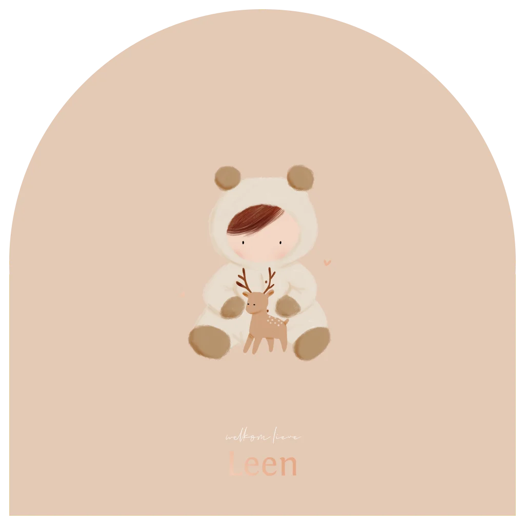 Warm geboortekaartje in boogvorm met een lief kindje in winters berenpak en schattig rendier. De zachte karamelkleurige achtergrond en handgetekende illustratie geven dit kaartje een knusse en lieve uitstraling voor een winterbaby!