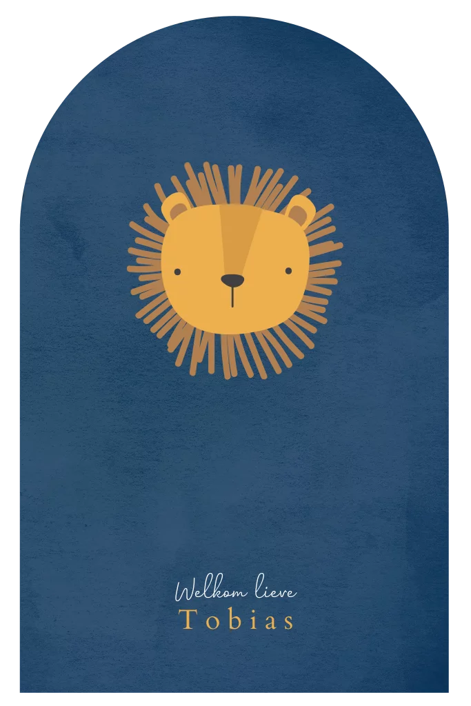 Een lief geboortekaartje om jullie kindje op een unieke manier aan te kondigen bij jullie familie en vrienden. In originele boogvorm met op de voorzijde een tekening van een lief leeuwtje op een donkerblauwe waterverf ondergrond. Het geboortekaartje kun je zelf aanpassen naar wens en smaak.