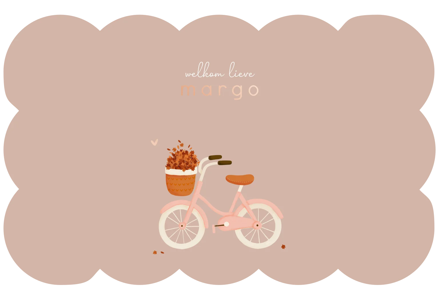 Een lief geboortekaartje in speelse koekvorm met een roze fietsje en een mand vol herfstblaadjes. Perfect voor een najaarsbaby en ideaal voor ouders die op zoek zijn naar een vrolijke en originele kaart voor hun dochter.
