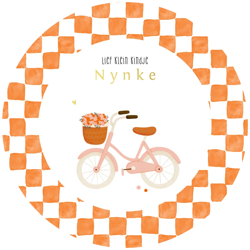 Uniek geboortekaartje in ronde vorm met een vrolijke illustratie van een roze fiets vol bloemen en een speels oranje ruitpatroon. De goudfolie maakt het ontwerp extra feestelijk en perfect voor de geboorte van jullie dochter.
