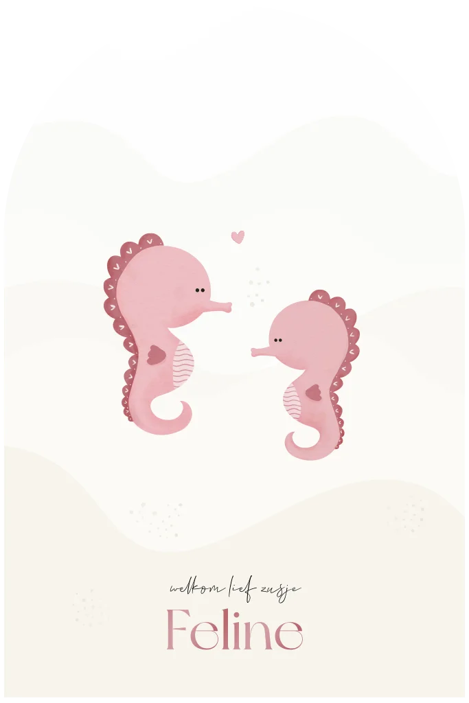 Dit lieve geboortekaartje met boogvorm en roze zeepaardjes straalt warmte en tederheid uit. De zachte tinten en speelse illustratie maken het perfect voor de geboorteaankondiging van een meisje. De naam en details zijn afgewerkt met hoogglans spotlak, waardoor ze prachtig glanzen en extra opvallen voor een luxe uitstraling.