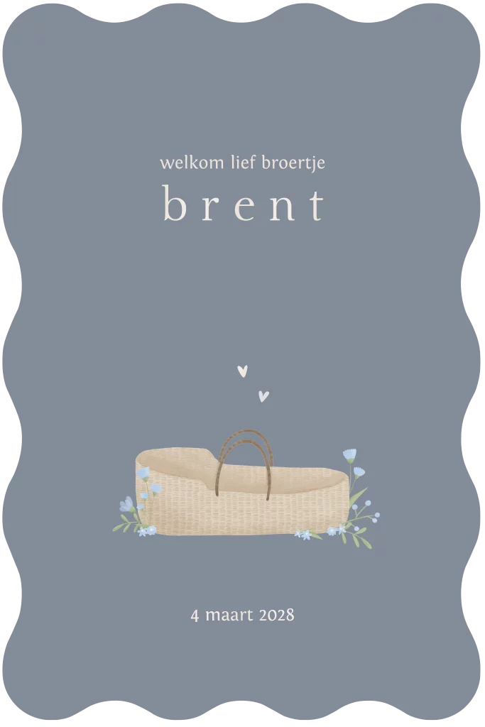 Geboortekaartje met mandje, lieve blauwe bloemetjes en een golvende rand