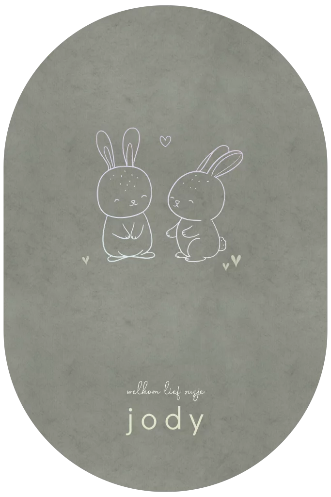 Een lief geboortekaartje met twee lieve konijntjes voor een nieuw broertje of zusje. Dit geboortekaartje is geschikt voor zowel jongens als meisjes en heeft een luxe uitstraling door de toepassing van folie. Pas de groene velvet look achtergrond naar wens aan.