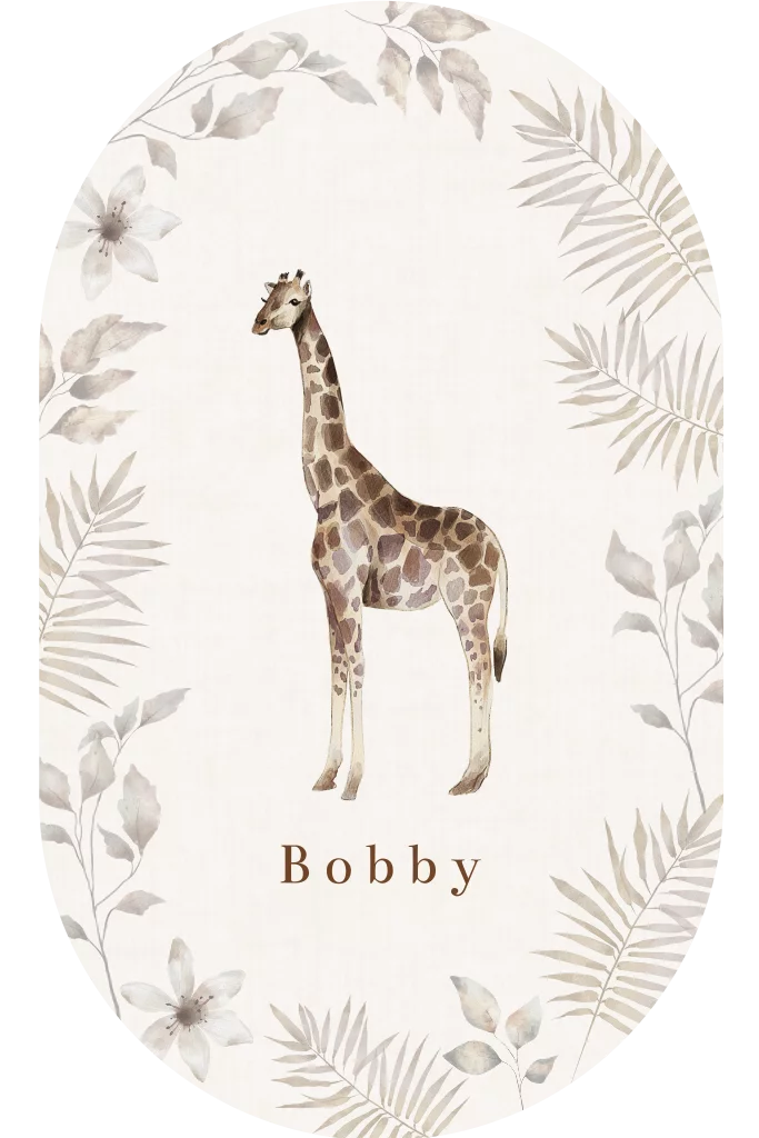 Een lief, ovaal geboortekaartje om de komst van jullie zoon of dochter op een originele manier aan te kondigen. Met lieve giraf en jungle bladeren getekend met waterverf in natureltinten. Pas het geboortekaartje naar wens aan bestel een proefdruk voor € 2,50 om dit kaartje in het echt te bewonderen.