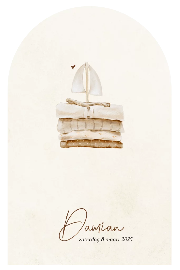 Mooi, naturel geboortekaartje voor een jongen met een stapel kleertjes en een zeilbootje. Getekend in waterverf op een gestanste boogvorm, uniek en trendy. Dit originele jongenskaartje kun je zelf bewerken in de editor.