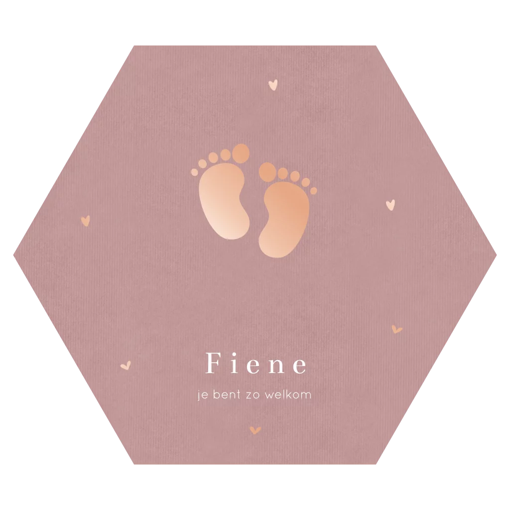 Een lief geboortekaartje in de vorm van een hexagon of honingraat voor een meisje. Dit zeshoekige geboortekaartje heeft een oudroze velvet look achtergrond en babyvoetjes in roséfolie. Wil je liever een andere kleur foliedruk? Dit kun je eenvoudig aanpassen.
