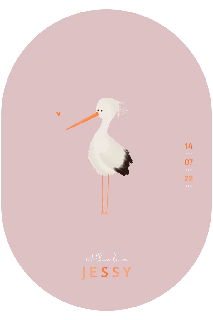 Dit originele geboortekaartje heeft een ovale vorm met een hoogglans afwerking en een schattige ooievaar in roze en oranje. Pas het geboortekaartje naar wens aan in de online editor en bestel een proefdruk om dit kaartje in het echt te zien.