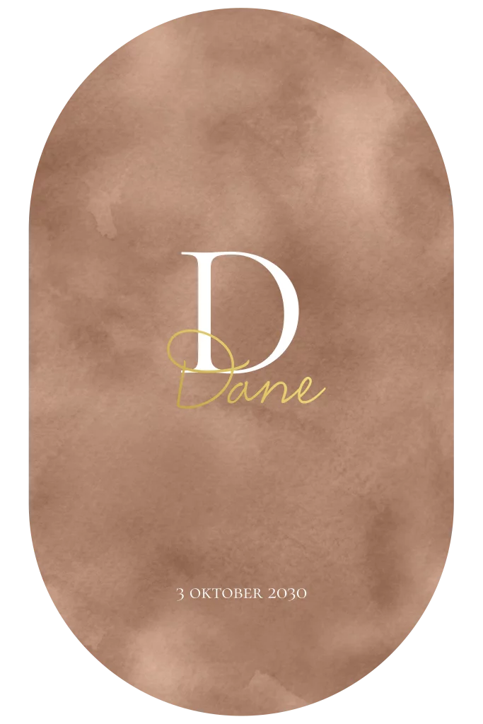 Ovaal geboortekaartje met initiaal en goudfolie op een bruine waterverf achtergrond. Pas de lettertypes aan en maak zo jouw unieke geboortekaartje.