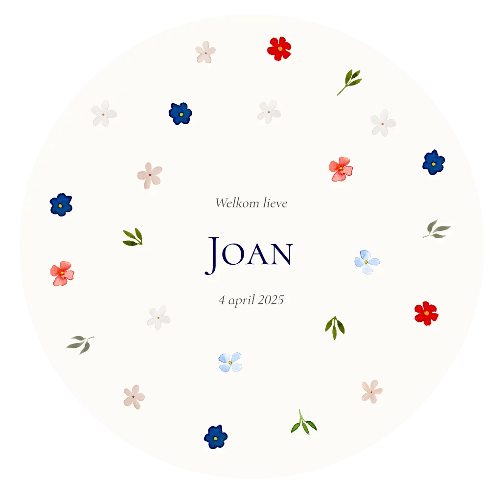 Een lief, rond geboortekaartje om de komst van jullie kindje aan te kondigen. Superlief en origineel. Met lieve, kleurrijke bloemetjes en groene blaadjes.