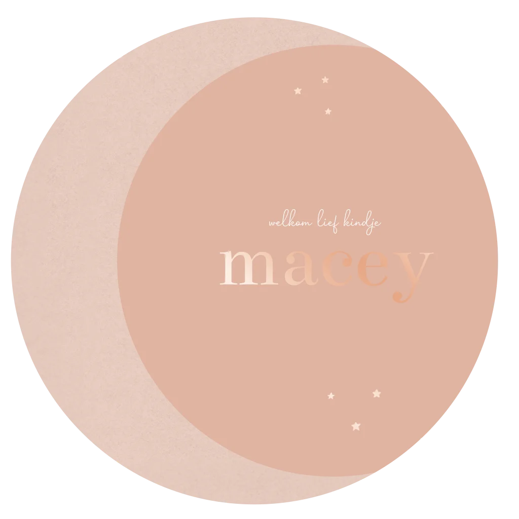 Ben je op zoek naar een uniek en luxe ontwerp voor de aankondiging van de geboorte van je dochter? Dit ronde geboortekaartje met maan en sterretjes in roséfolie is perfect voor ouders die op zoek zijn naar iets bijzonders voor hun kleine meisje. Pas de kleuren en de vorm van de maan eenvoudig naar wens aan.