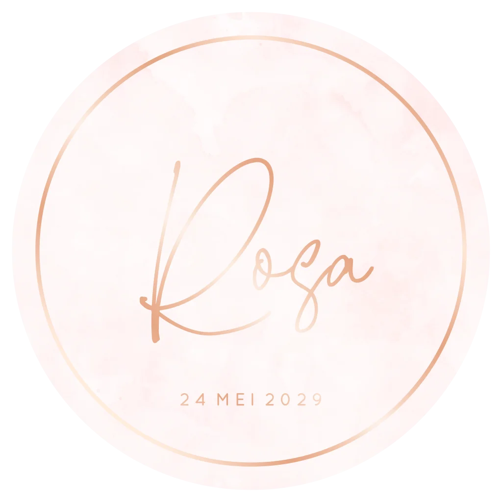 Rond geboortekaartje met roze waterverf en roséfolie. Je kunt zelf kiezen welke kleur foliedruk je wilt en ook kun je de lettertypes aanpassen in de online editor.