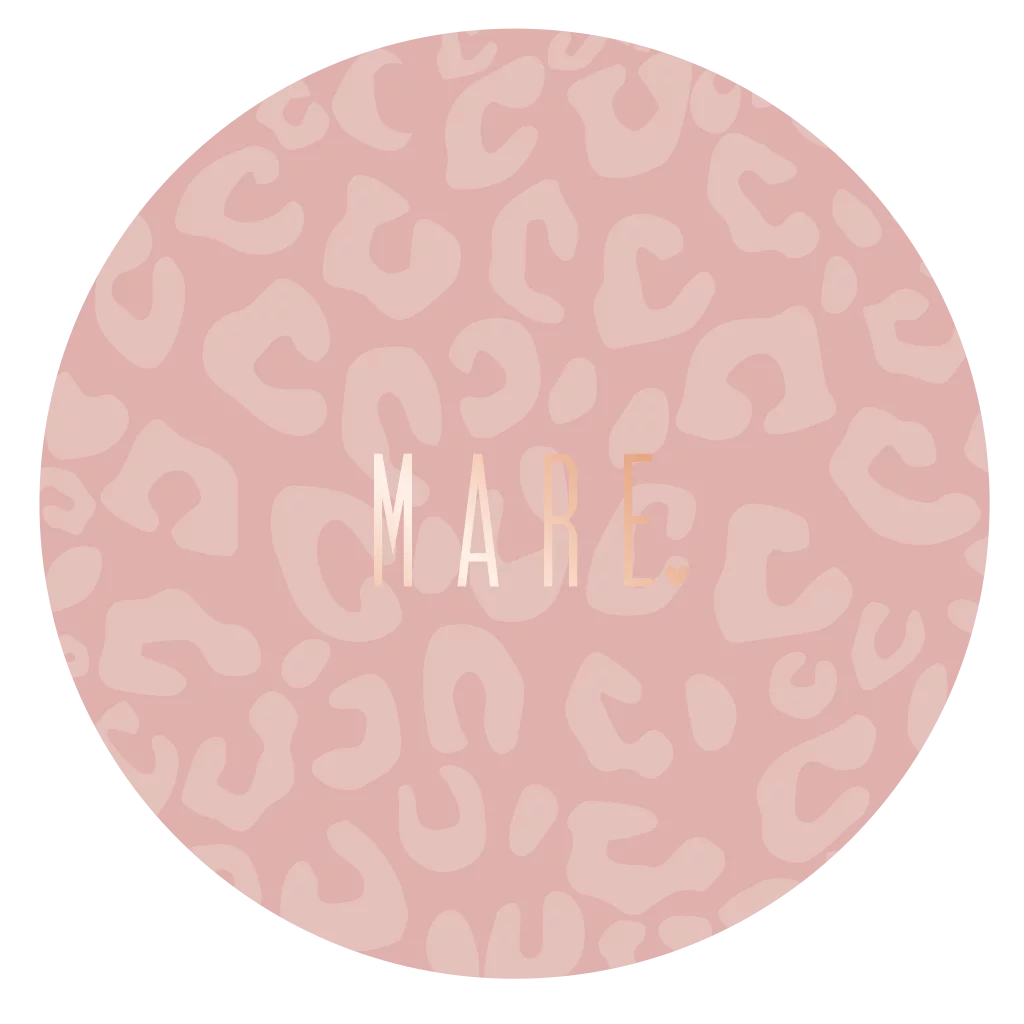 Ronde geboortekaart met roze panterprint en roséfolie voor een meisje. De roze kleur van het panterprintje, de kleur van de folie en ook de lettertypes kun je eenvoudig naar wens aanpassen zodat het geboortekaartje helemaal bij jullie past.