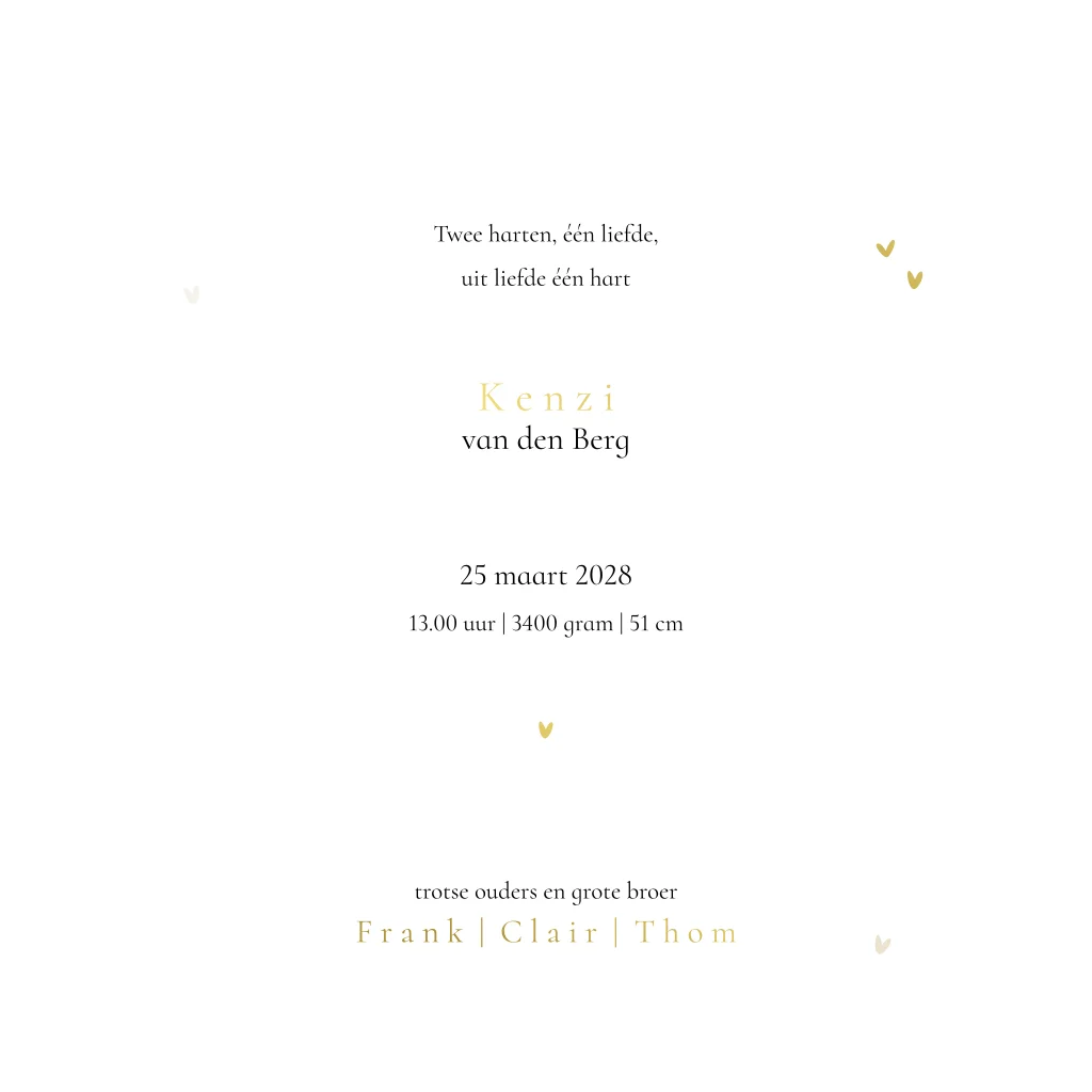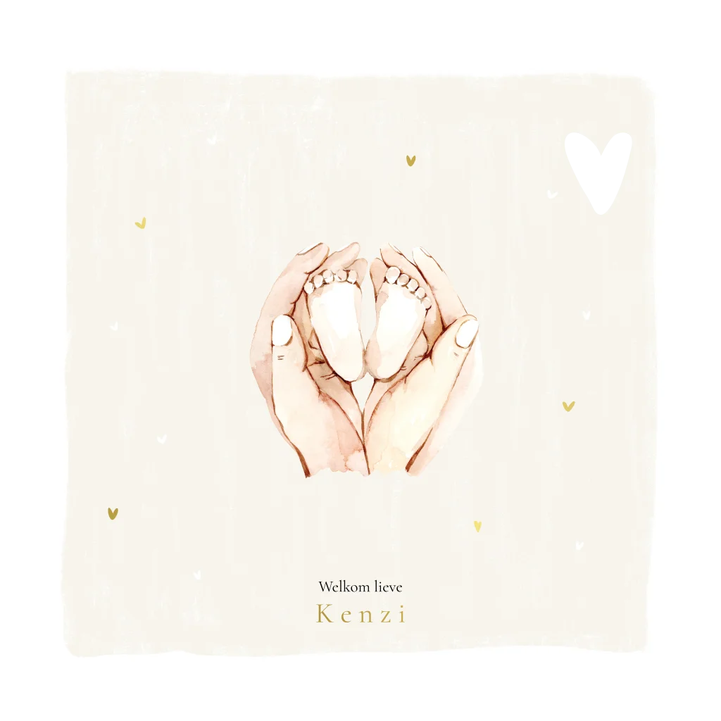 Naturel geboortekaartje met een uitgesneden hartje en een zachte illustratie van babyvoetjes in liefdevolle handen.