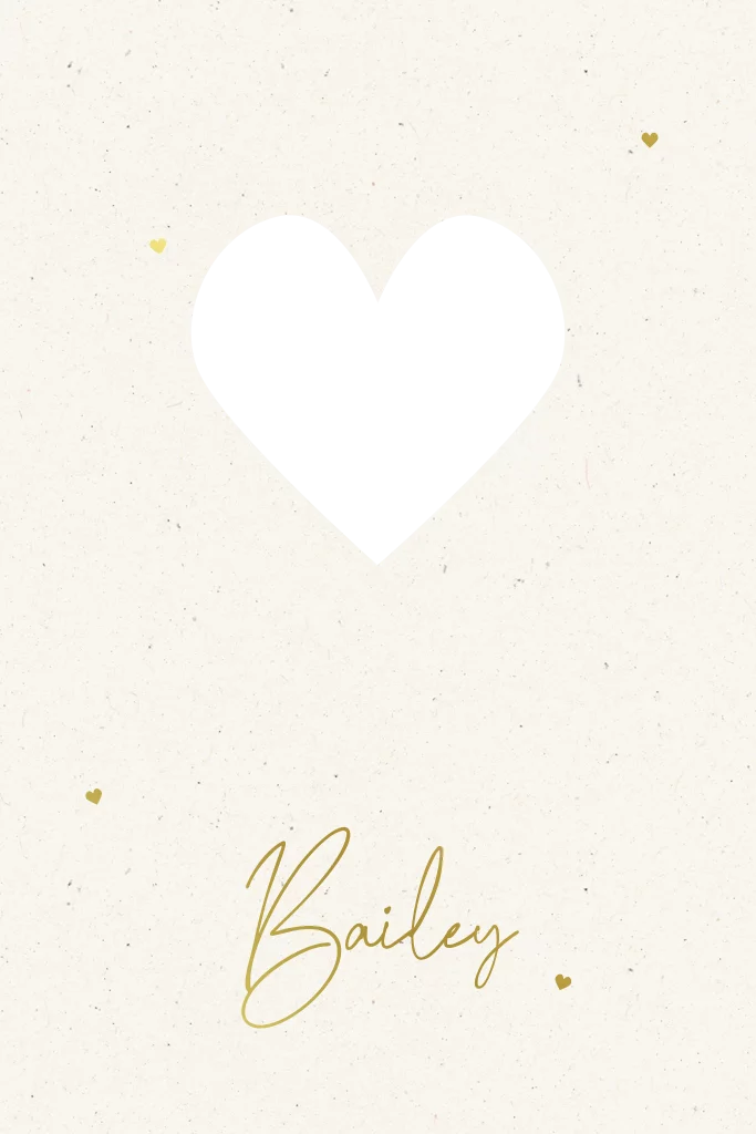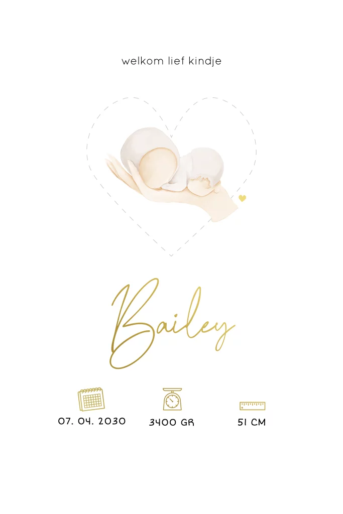 Een neutraal geboortekaartje met tekening van een lieve baby in waterverf. Dit naturel geboortekaartjes heeft een uitgesneden hartje op de voorkant en hartjes in goudfolie. Pas eenvoudig de achtergrondkleur en lettertypes aan en maak zo jouw unieke geboortekaart.