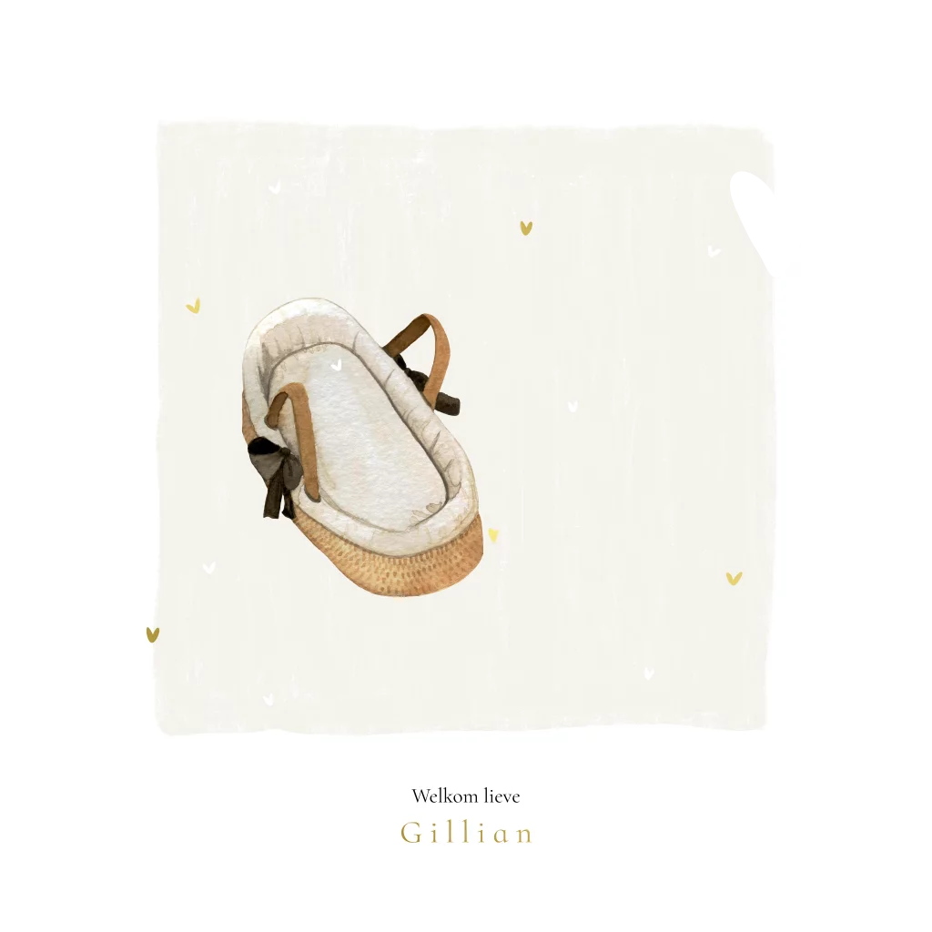 Neutraal geboortekaartje met wiegje en uitgesneden hartje