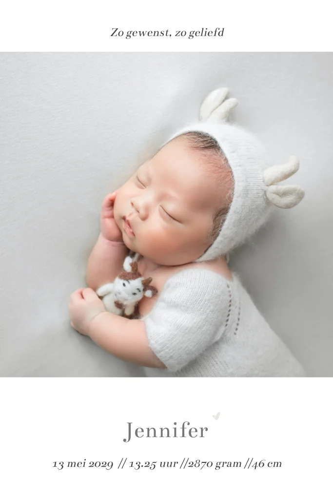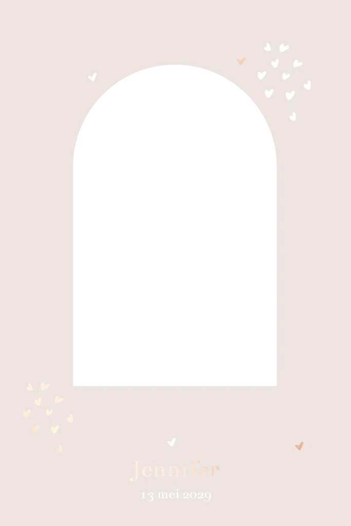 Een origineel geboortekaartje voor een jongen of meisje met een stansvorm uitgesneden op de voorkant in naturel kleuren en roséfolie. Dit geboortekaartje heeft een doorkijkje naar de binnenzijde voor een lieve babyfoto. Pas eenvoudig de achtergrondkleur en lettertypes aan en maak zo jouw unieke geboortekaart.