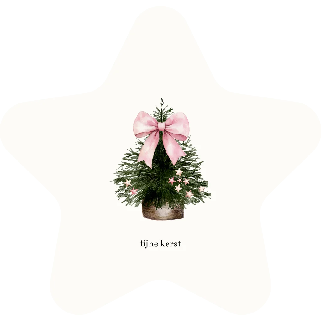 Een opvallend kerstkaartje in de vorm van een ster, met een lieflijke illustratie van een kerstboompje, versierd met een grote roze strik en kleine roze sterretjes. Perfect voor wie de feestdagen op een stijlvolle en originele manier wil vieren.
