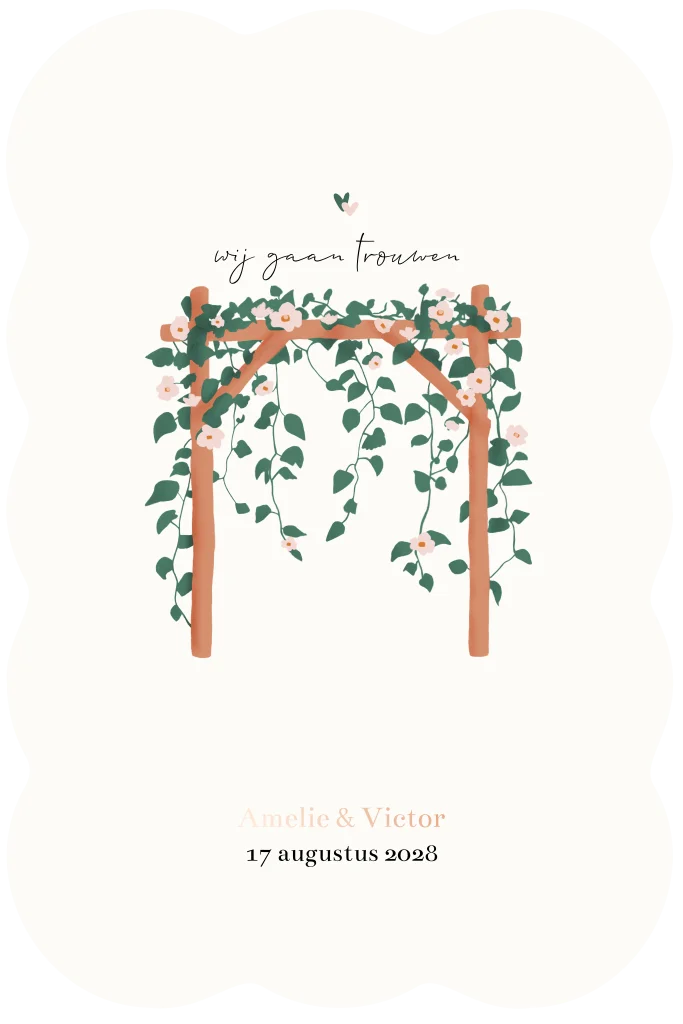 Romantische trouwkaart met sierlijke stansvorm met kartelrand en bloemenprieel. Perfect voor een bruiloft in de buitenlucht of tuin. Lief, speels en elegant tegelijk.