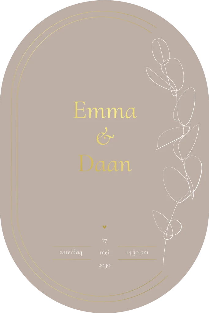 Een elegante, klassieke trouwkaart met ovale vorm, botanische lijnillustratie en chique goudfolie op zacht taupe. De kleur van de naturel achtergrond en de folie kun je eenvoudig aanpassen.