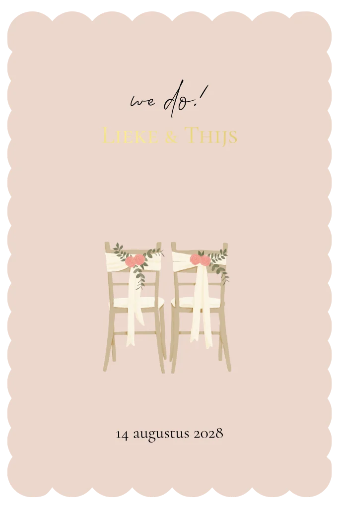 Romantische trouwkaart in zachte oudroze tint met elegante scallop rand. De illustratie van twee stoeltjes met bloemenlint geeft de kaart een warme, intieme sfeer. De namen in goudfolie zorgen voor een subtiel luxe accent. Pas de trouwkaart naar wens aan en bestel snel een proefdruk.