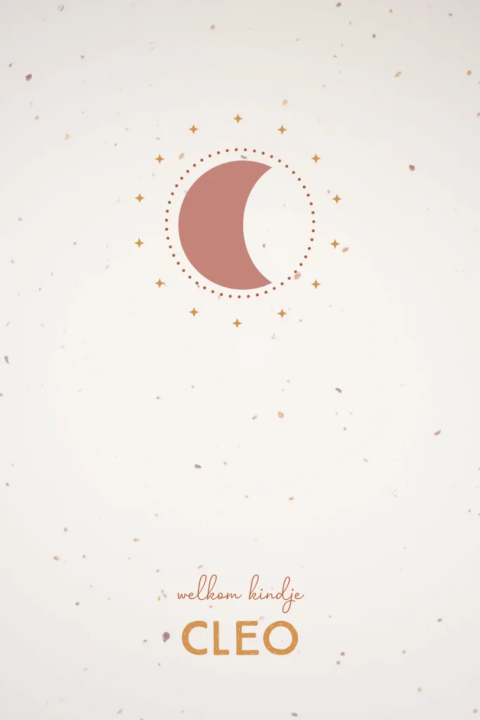 Duurzaam en minimalistisch geboortekaartje met maan in een cirkel met sterren. Pas de kleuren van de illustraties en lettertypes eenvoudig aan in de online editor zodat het geboortekaartje helemaal bij jullie past.