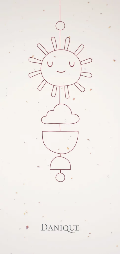 Duurzaam en lief geboortekaartje voor een meisje of een jongen met op de voorzijde een lijntekening van een hanger met zonnetje en wolkje.