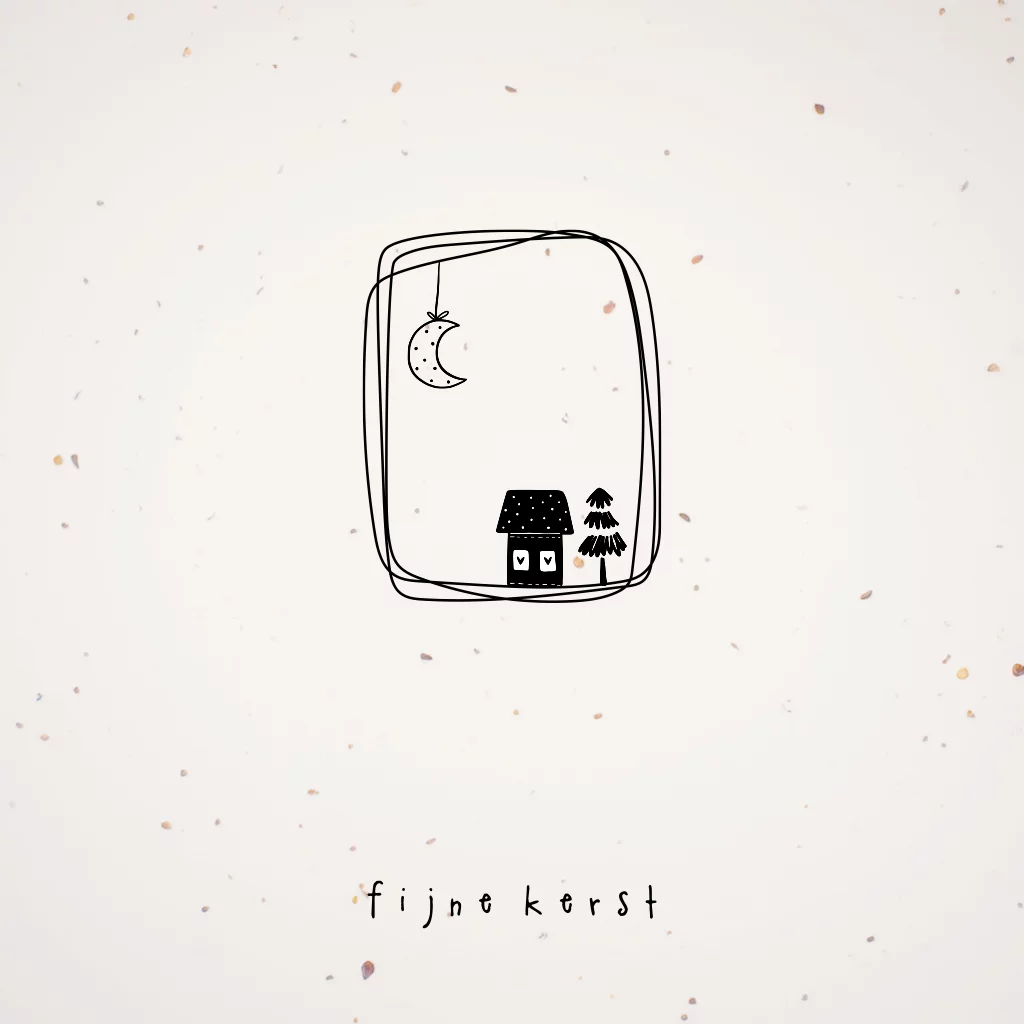 Een dromerig kerstkaartje met een eenvoudig huisje onder een fonkelende maan en een kleine kerstboom ernaast. De illustratie straalt rust, warmte en verbondenheid uit perfect om iemand fijne feestdagen te wensen met een vleugje magie.