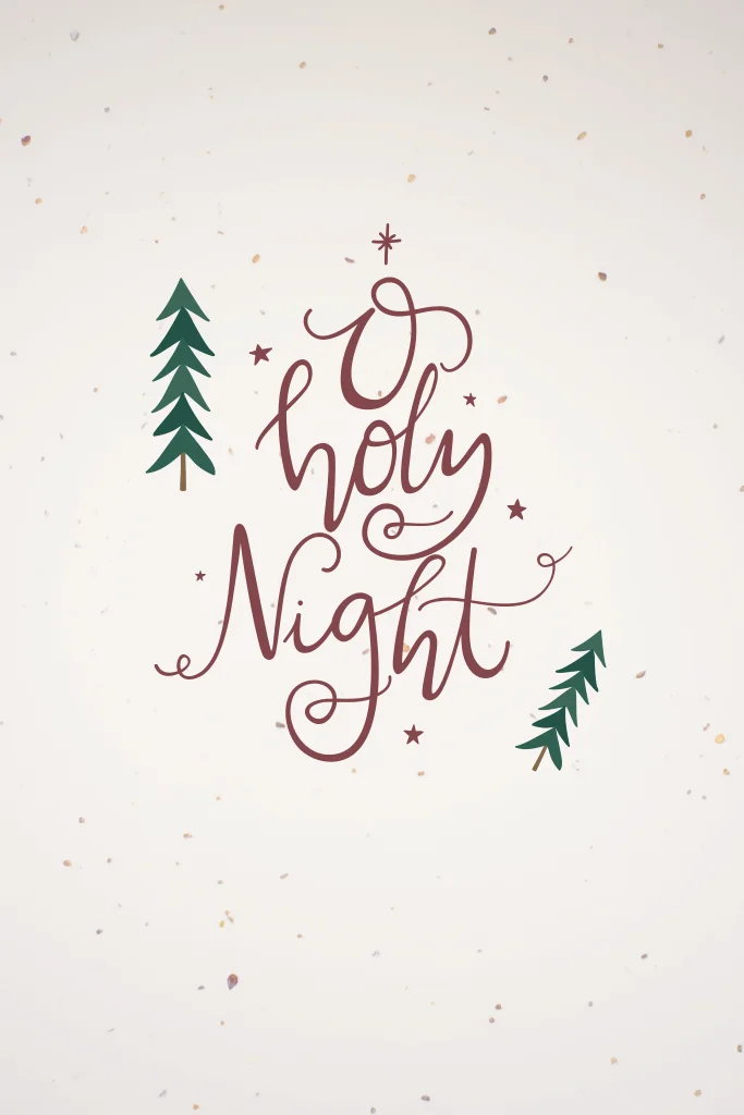 Een sfeervol kerstkaartje met de sierlijke tekst O holy night omringd door kleine kerstboompjes en sterretjes. De combinatie van elegante letters en natuurlijke kleuren zorgt voor een klassieke, maar eigentijdse uitstraling, perfect om warme kerstgroeten te versturen.