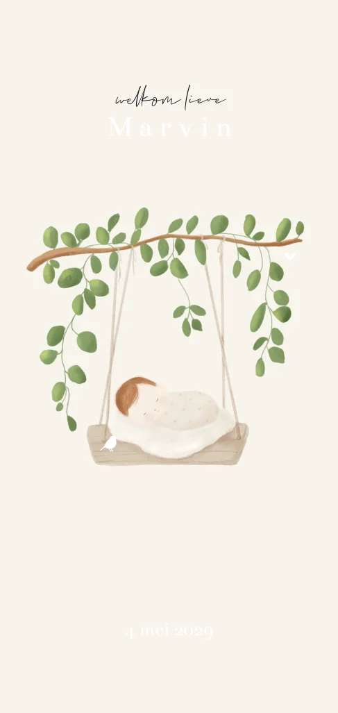 Lief geboortekaartje met een slapende baby in een schommel onder een tak met blaadjes. De zachte kleuren en handgetekende illustratie geven het kaartje een rustige, natuurlijke uitstraling. Pas naam, kleuren en lettertypes eenvoudig aan in de editor en maak er jullie eigen unieke geboortekaartje van.