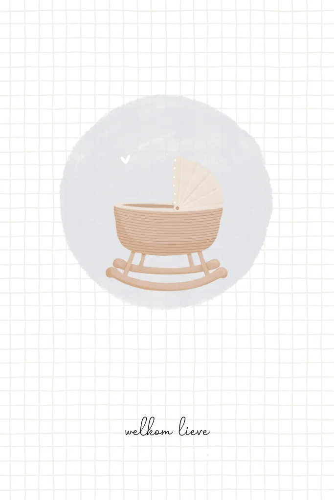 Lief geboortekaartje met een illustratie van een schattig wiegje, ruitjespatroon en roséfolie. Pas het geboortekaartje naar wens aan in de online editor en bestel een proefdruk om dit kaartje in het echt te zien.