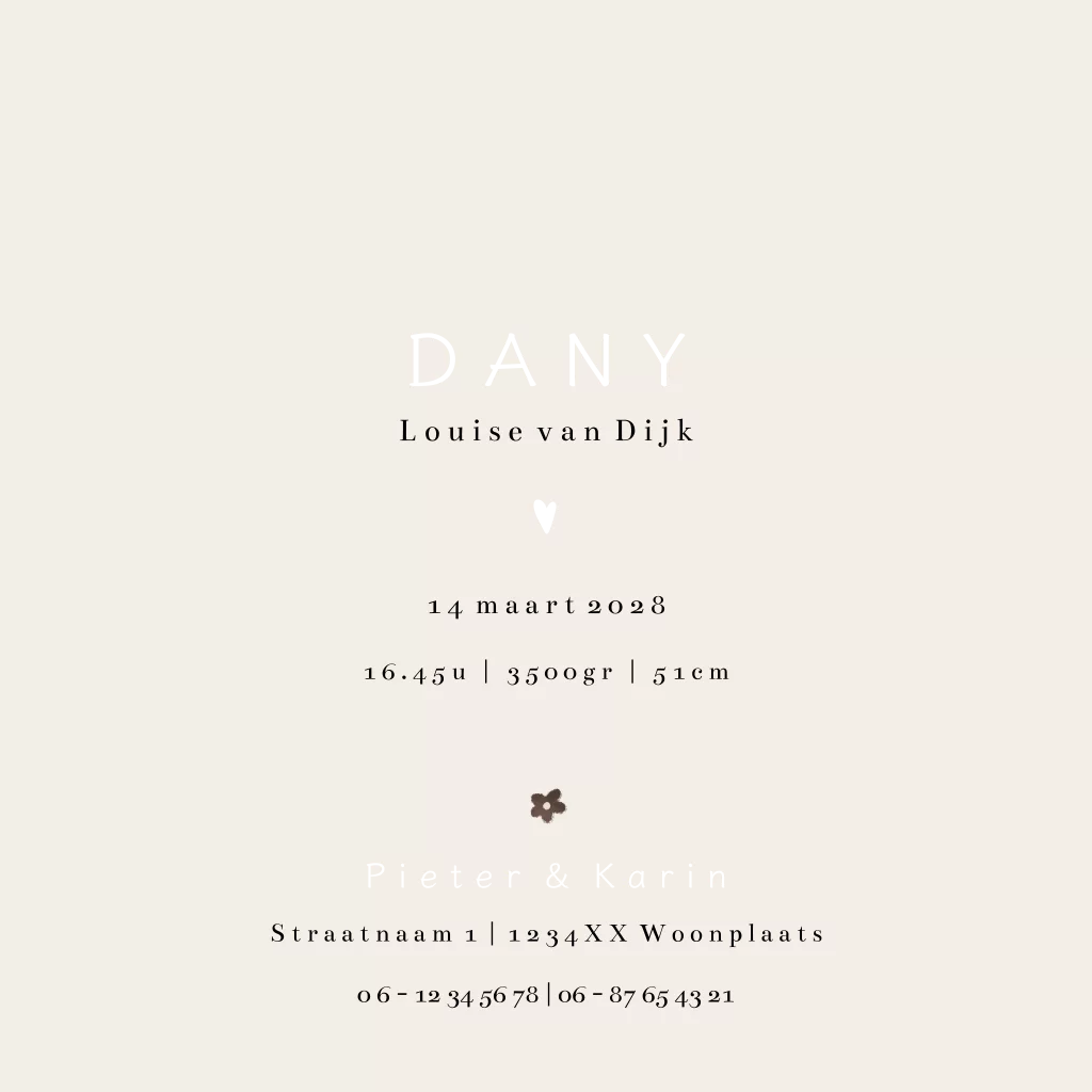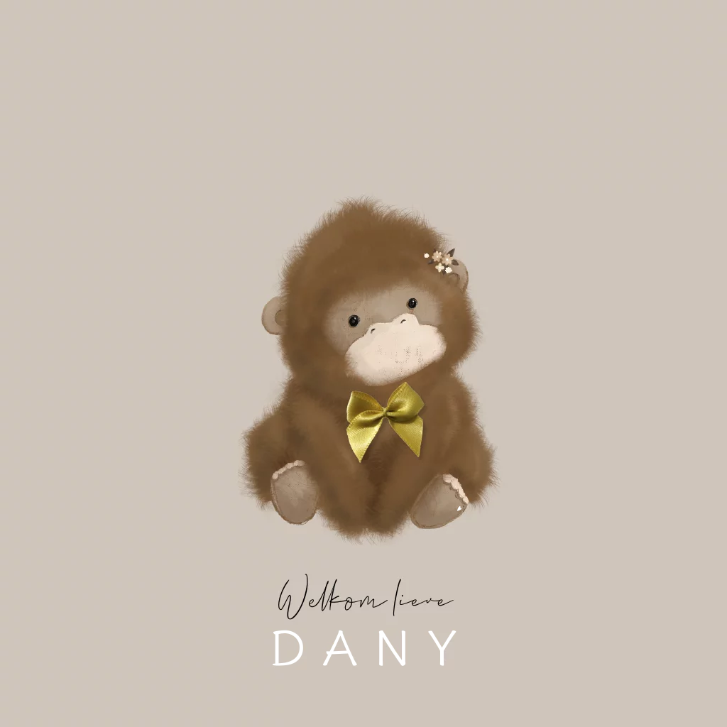 Een origineel geboortekaartje met een lief aapje, bloemetjes en een echt satijnen strikje! Voor ouders die op zoek zijn naar een schattig en uniek ontwerp voor de aankondiging van de geboorte van hun kindje. Je kunt de bloemetjes en/of het strikje ook weglaten als dat beter bij je past.