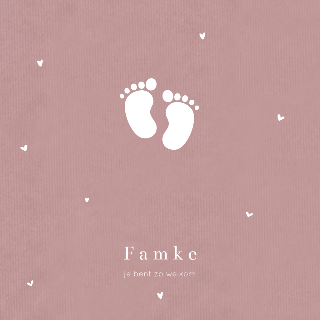 Schattig geboortekaartje voor een lief klein meisje in oudroze met voetjes en hartjes in roséfolie. Wil je een andere kleur folie? Pas het eenvoudig zelf aan in de online editor. In het kraamboek kan de kraamvisite een lieve boodschap achterlaten voor jullie dochter of met het tuinbord laten jullie de hele buurt weten dat jullie dochter geboren is.