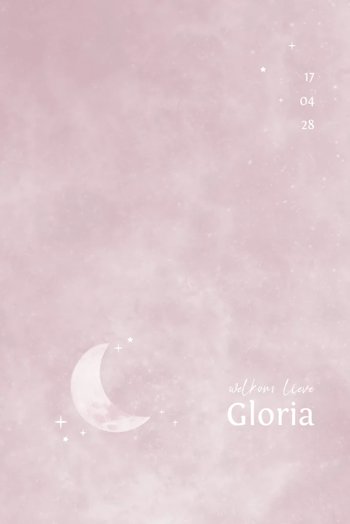 Dit geboortekaartje voor een meisje met roze maan en sterren in goudfolie op een lichtroze achtergrond kun je zelf eenvoudig aanpassen naar wens.