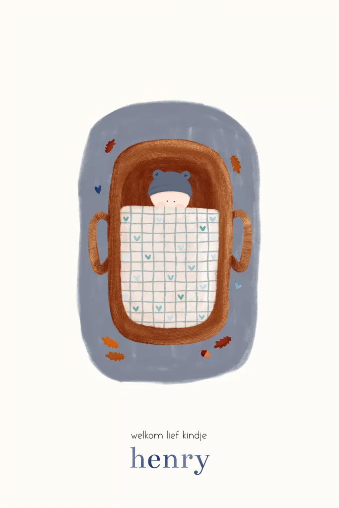 Lief geboortekaartje herfst illustratie baby in mandje blauw