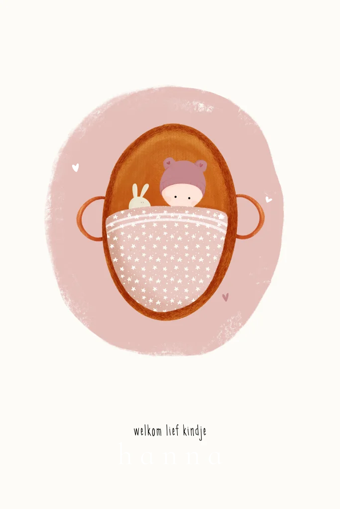 Een lief geboortekaartje met een schattige baby met roze mutsje en knuffelkonijn in een mandje. De geboortekaartjes zijn verkrijgbaar vanaf een minimum oplage van 5 stuks, zodat je precies de juiste hoeveelheid kunt bestellen voor de geboorte van jullie dochter. .