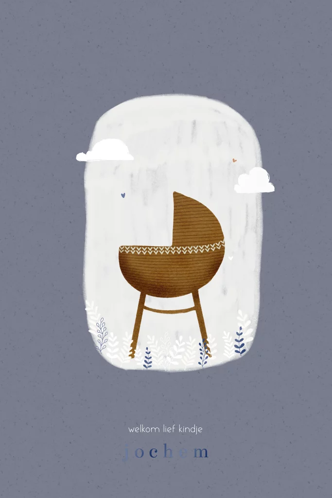 Een lief geboortekaartje met een schattig wiegje op een blauwe achtergrond met bloemen en hartjes in hoogglans.Pas het kaartje eenvoudig aan naar jouw wensen!