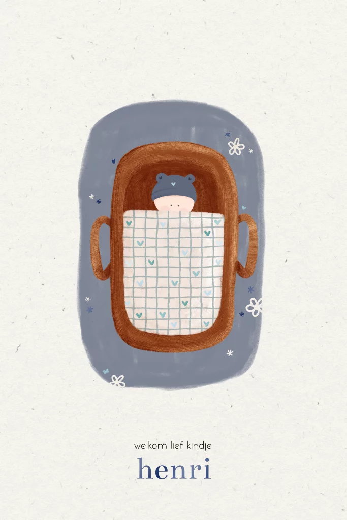 Lief geboortekaartje lente illustratie baby in mandje blauw