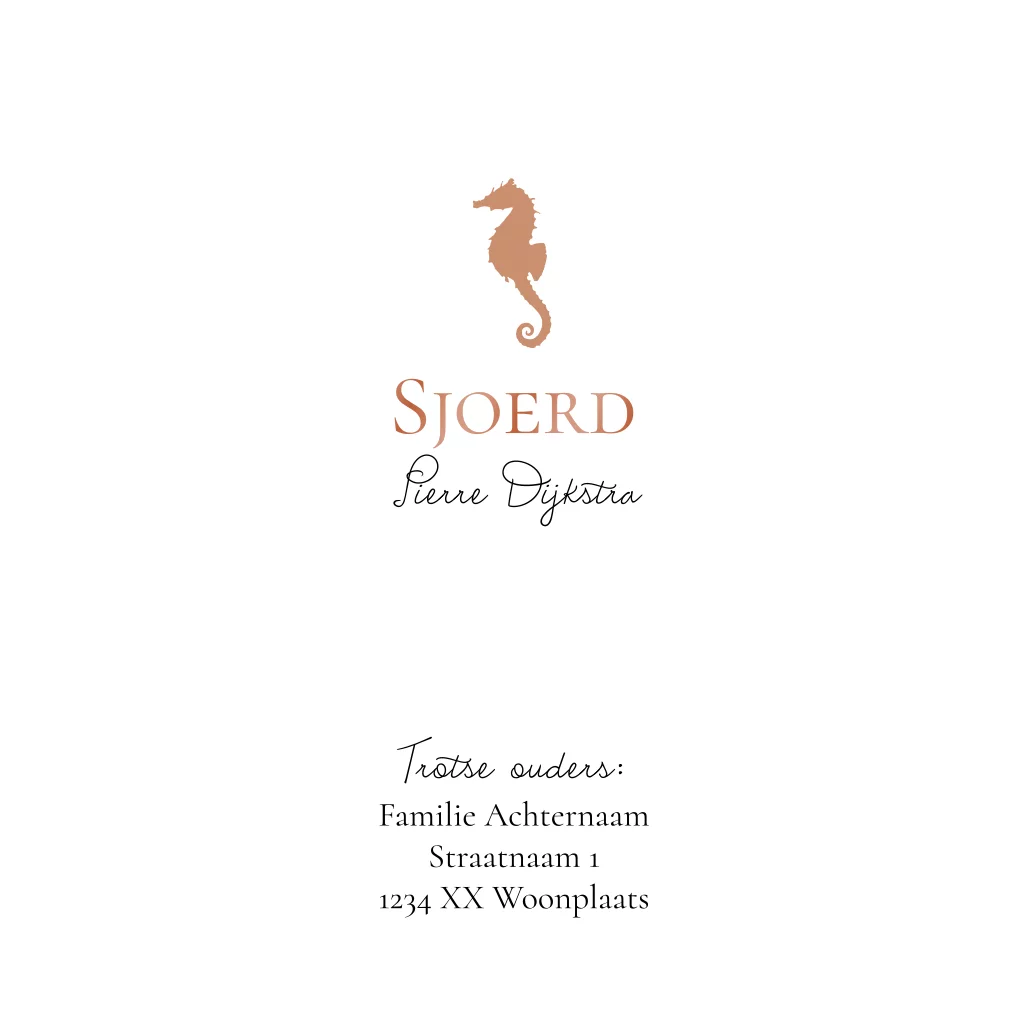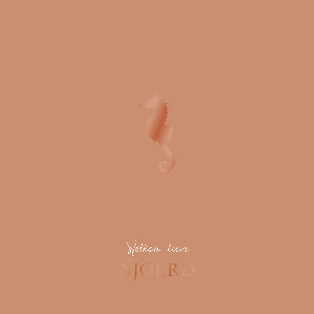 Eenvoudig en lief geboortekaartje voor een jongen of meisje met een lief zeepaardje in hoogglans folie op een roestbruine achtergrond. Voeg eventueel een fotolabel toe voor een heel persoonlijk geboortekaartje.