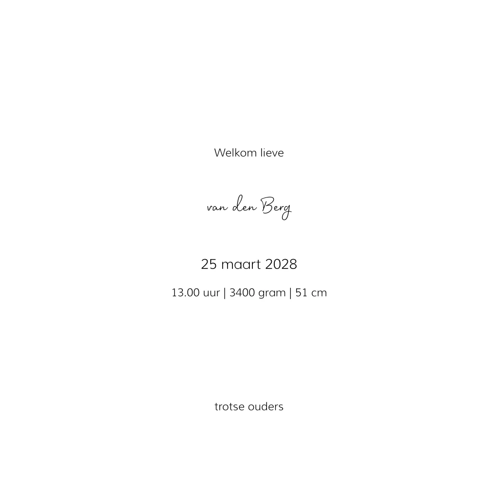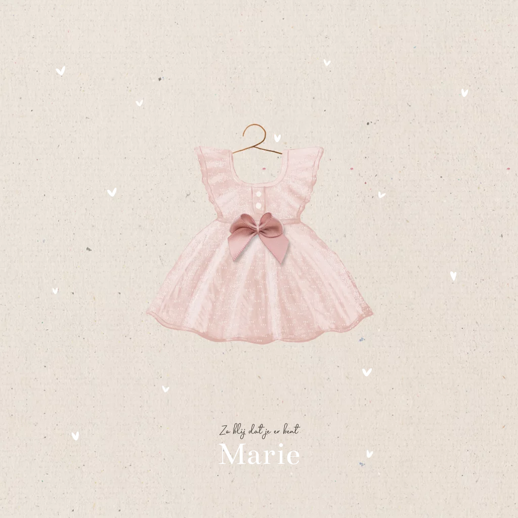 Dit lieve meisjesgeboortekaartje is echt uniek, met een schattig strikje en een prachtige roze jurk met roségouden hartjes. Welkom op de wereld, kleine prinses! Het strikje op dit kaartje wordt niet afgedrukt, deze is alleen als voorbeeld. Op die plek kun je straks zelf het echte strikje plakken die je er apart bij bestelt.