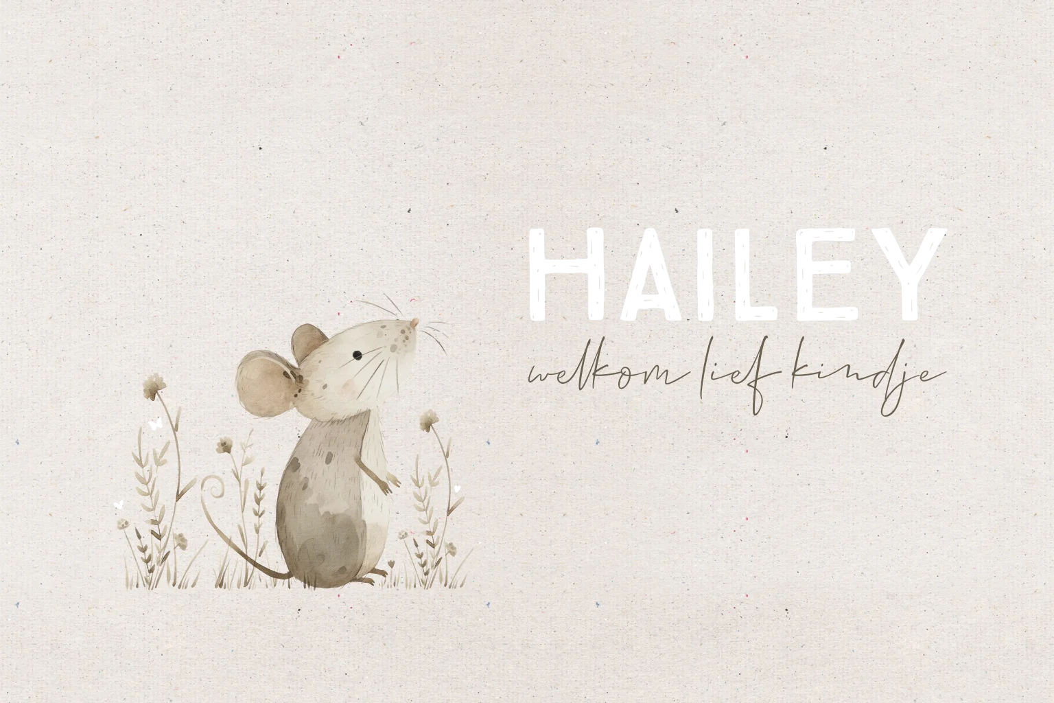 Een lief, neutraal geboortekaartje met lief muisje op een naturel achtergrond. Een illustratief, lief geboortekaartje voor de aankondiging van de geboorte van jouw zoon of dochter. De naam is in koperfolie, de kleur en het lettertype kun je eenvoudig zelf aanpassen.
