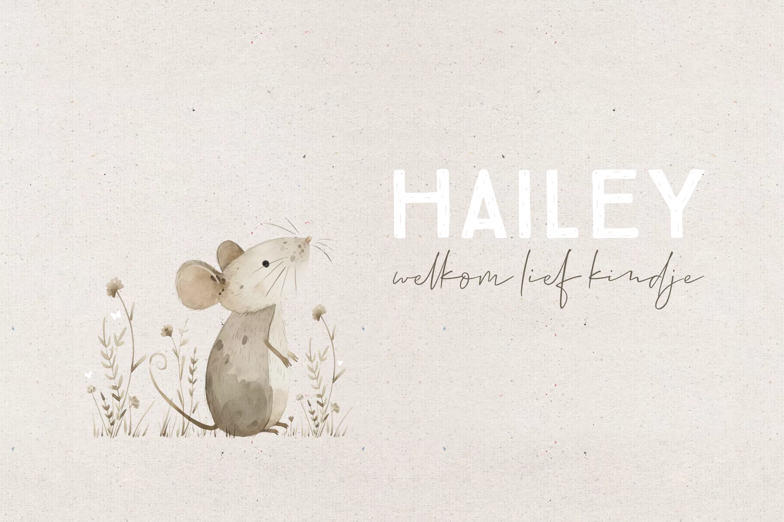 Een lief, neutraal geboortekaartje met lief muisje op een naturel achtergrond. Een illustratief, lief geboortekaartje voor de aankondiging van de geboorte van jouw zoon of dochter. De naam is in roséfolie, de kleur en het lettertype kun je eenvoudig zelf aanpassen.