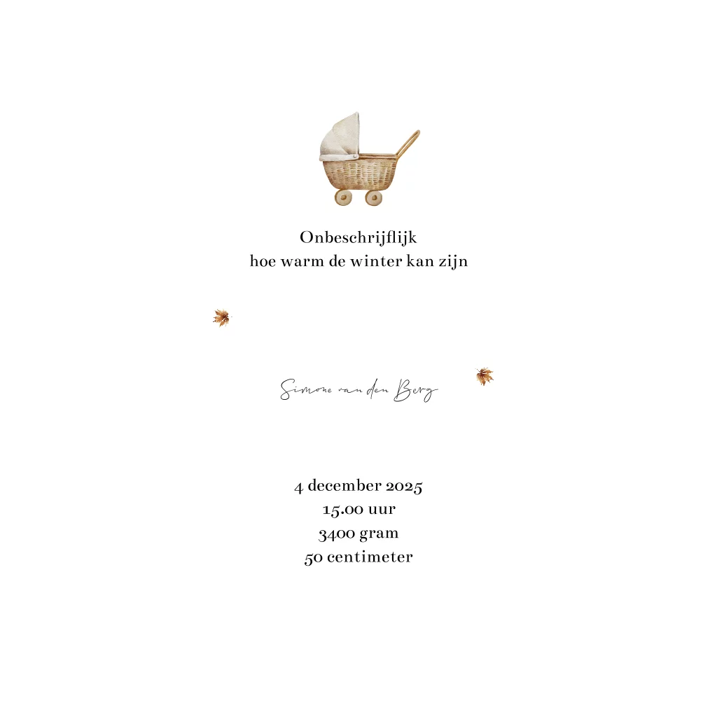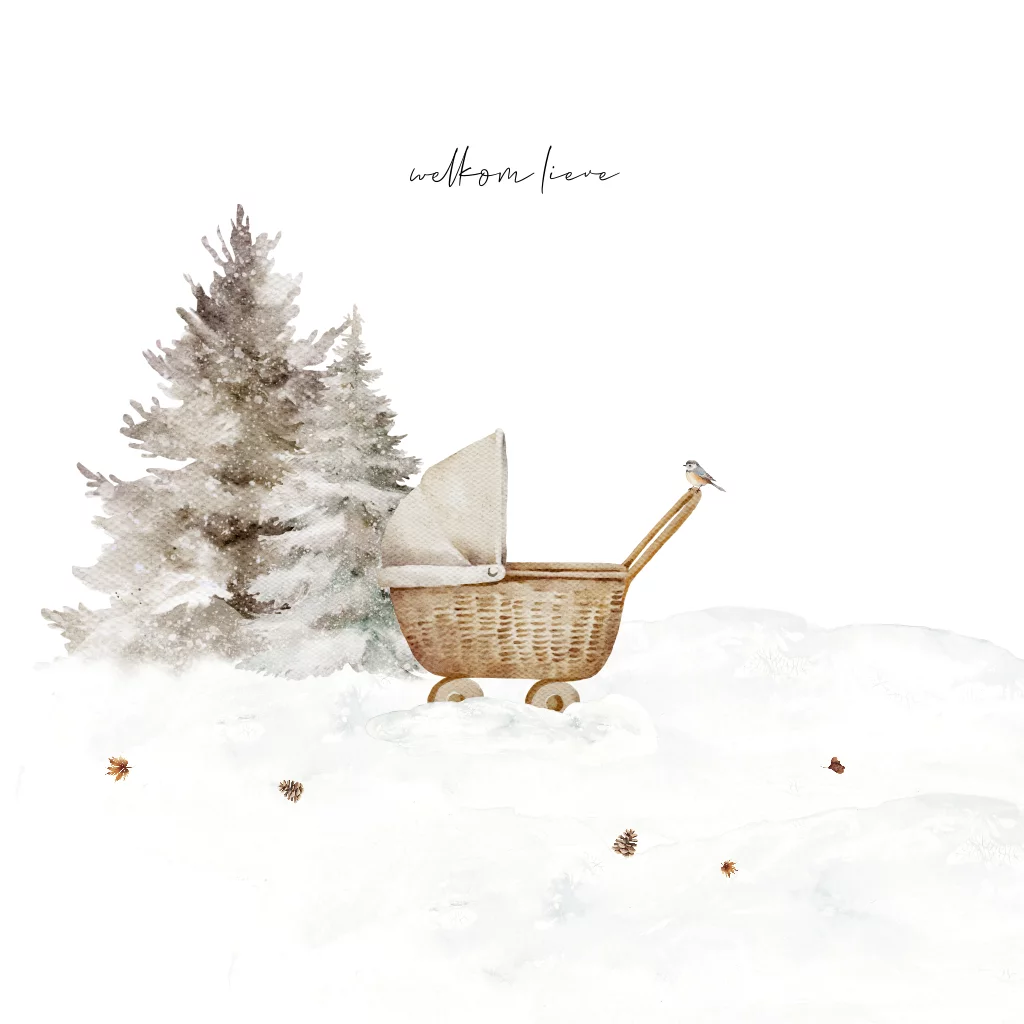 Winter geboortekaartje met een schattige kinderwagen met vogeltje in de sneeuw. Je kunt dit winterkaartje eenvoudig zelf bewerken en aanpassen. Leuk voor zowel jongens als meisjes.