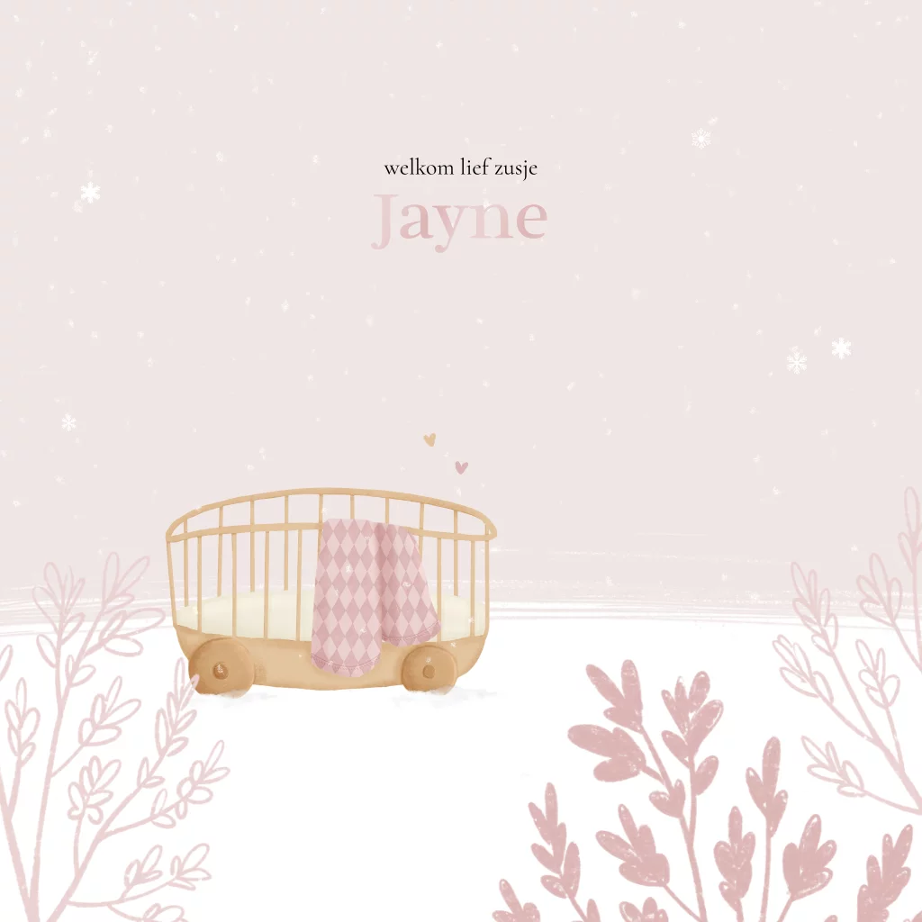 Een lief winter geboortekaartje met een ledikantje en schattig dekentje en sneeuwvlokken in een roze winterlandschap. Pas het geboortekaartje naar wens aan voor de geboorte van jullie dochter.