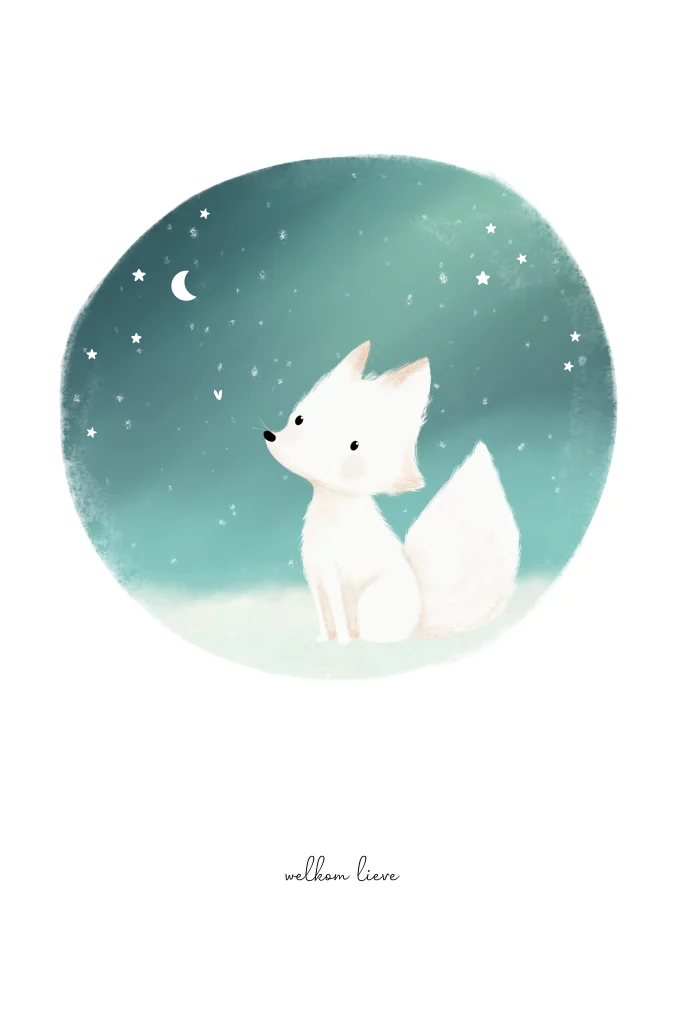 Een winters geboortekaartje met het Noorderlicht op de achtergrond, gouden sterren, een maan en een lief poolvosje in de sneeuw. Wil je dat we even met jouw ontwerp meekijken? Stuur een berichtje.We helpen je graag.