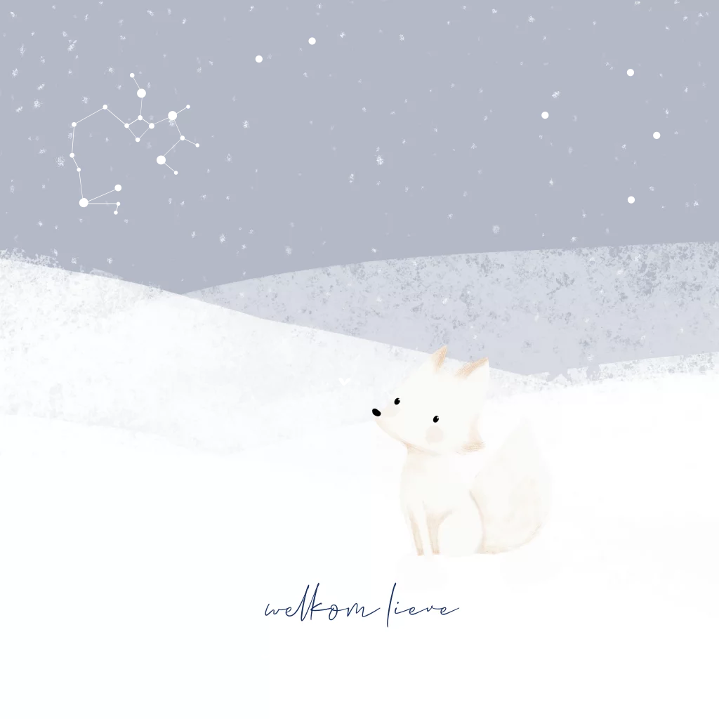 Een lief geboortekaartje voor jouw winterkindje. Op de voorkant van dit vierkante kaartje staat een lief wit vosje in de sneeuw met sterrenbeeld in goudfolie. Deze kun je eenvoudig aanpassen net als de rest van het kaartje.