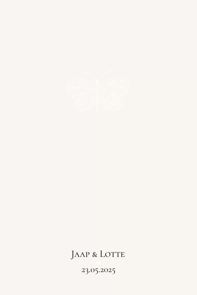 Een mooie, romantische trouwkaart met handgetekende vlinder in goudfolie. De kleur van de achtergrond en de foliedruk kunnen gewijzigd worden.