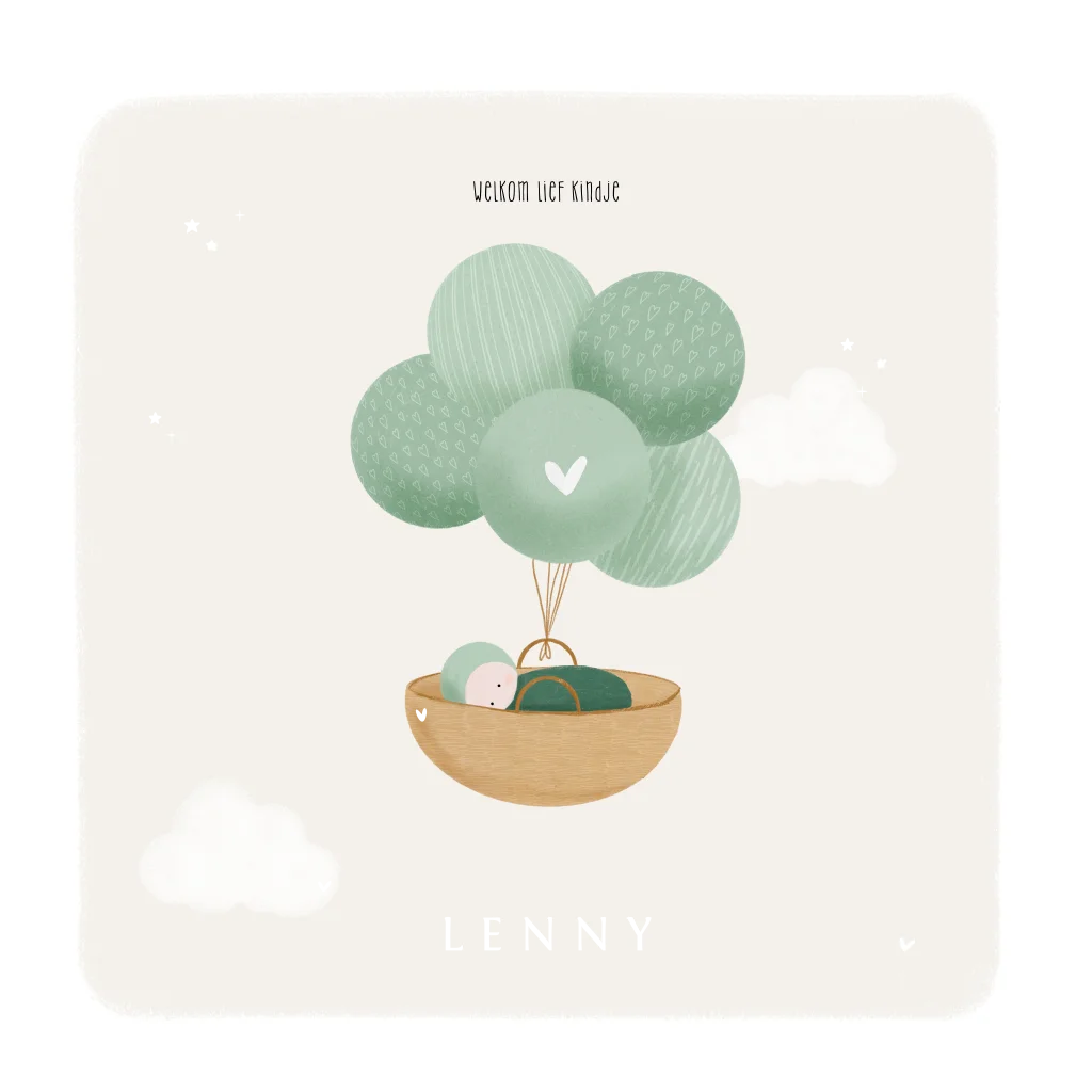 Vrolijk geboortekaartje voor jullie kleintje met een lieve baby in een mandje zwevend aan groene ballonnen. Pas het ontwerp aan in onze online editor.