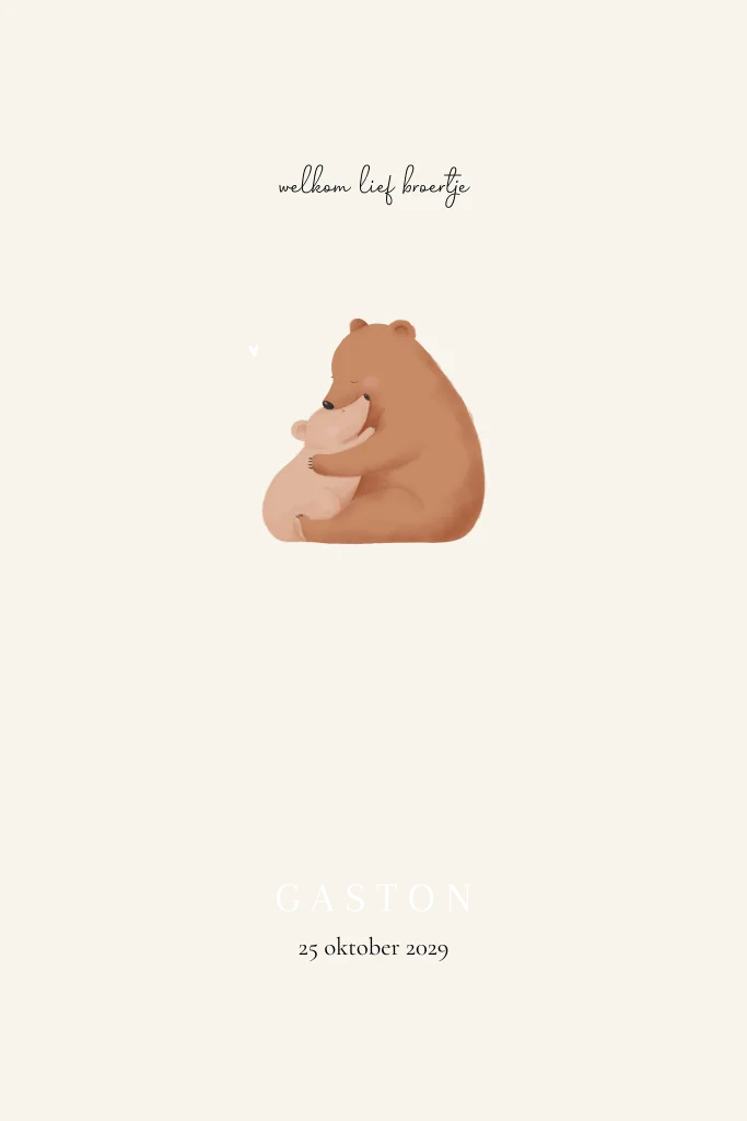 Lief en tijdloos geboortekaartje met twee knuffelende beertjes in warme, zachte tinten. De naam en het hartje worden gedrukt in koperfolie voor een subtiel en luxe detail. Een warm ontwerp dat perfect past bij de komst van een broertje.