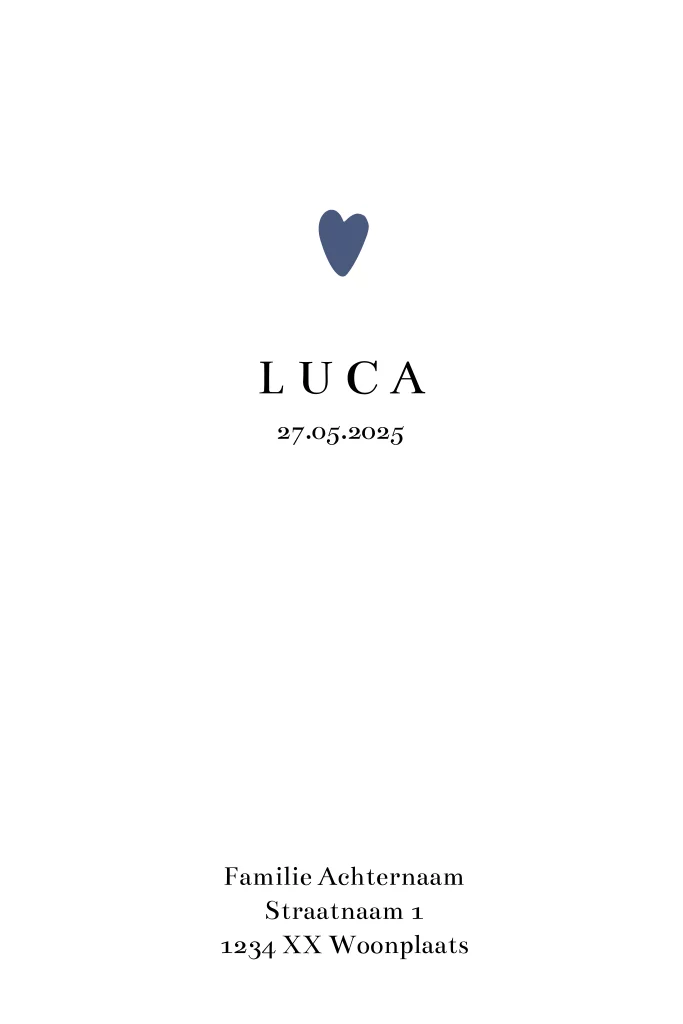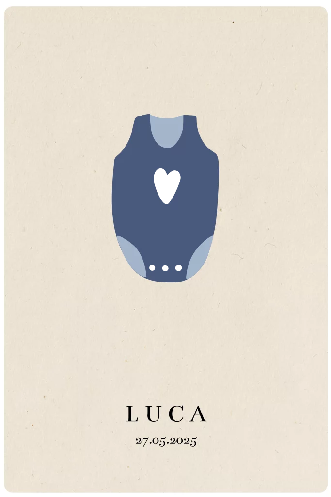 Een stijlvol en minimalistisch geboortekaartje om de geboorte van jullie kleintje aan te kondigen. Het hartje en de knoopjes van het blauwe rompertje worden in roséfolie aangebracht. Wil je liever een andere foliekleur? Dit kun je aanpassen in de editor.